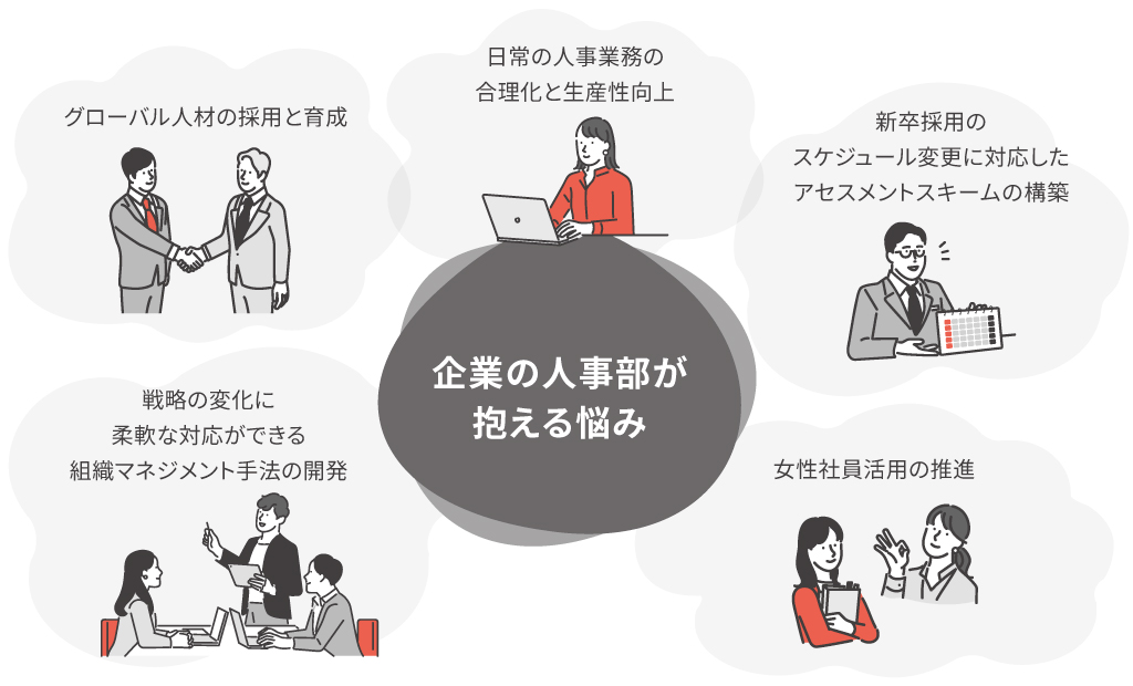 顧客企業が抱える問題に応じて、顧客企業の人事部と共に、課題の定義や解決策の構想を進めていきます。