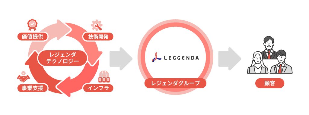 私たちの役割は「技術開発」「インフラ」「事業支援」など多岐にわたります。このサイクルは、それら全てがレジェンダグループのサービス(実行支援)と、お客様への「価値提供」に不可欠であることを示しています。グループ全体の技術基盤を支え、お客様の課題解決に貢献します。