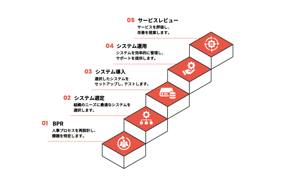 人事労務の課題をBPR(業務改革)で可視化し、最適なシステム選定・導入、その後の運用(BPO)までをワンストップで伴走します。導入して終わりではなく、日々の運用やレビューを通じて常に改善を提案し続けます。お客様がより戦略的な業務に集中できるよう、人事部門の「あるべき姿」を実現するパートナーとして支援します。